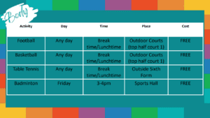 Table Tennis Club is open to all abilities as a fun way for students (and staff) to let off steam in between studying! Equipment is provided by sixth form and gives a chance to build connections with friends, relieve stress and support physical health.