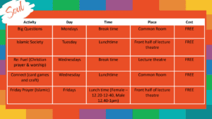 Christian Union takes place weekly. There are also drop in sessions hosted by the Christian Youth Workers for new and existing members where refreshments are served and students have the opportunity to discuss scriptures, worship and get to know one another. Christian Union is open to all.